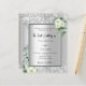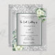 Faux silver looking background decorated with white florals, flowers, eucalyptus greenery and confetti. Personalise and add your names and wedding details. Black letters.