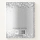 Faux silver looking background decorated with white florals, flowers, eucalyptus greenery and faux silver glitter, sparkles. Personalise and a year, name and a title/text