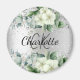 A faux silver looking background decorated with white florals, flowers and eucalyptus greenery. Personalize and add your monogram initials and first name