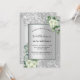 Faux silver looking background decorated with white florals, flowers, eucalyptus greenery and faux silver glitter, sparkles. Personalise and add your name and party details. Black letters.