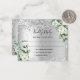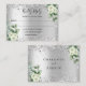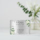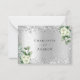 A faux silver metallic looking background, decorated with confetti and white florals, eucalyptus greenery. Personalise and add the reply by date and your names.