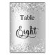 The table number is written with an elegant hand lettered style script. Black letters, a white background on front and faux silver background with faux glitter dust, sparkles on the back.