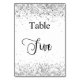 The table number is written with an elegant hand lettered style script. Black letters, a white background on front and faux silver background with faux glitter dust, sparkles on the back.