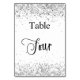 The table number is written with an elegant hand lettered style script. Black letters, a white background on front and faux silver background with faux glitter dust, sparkles on the back.
