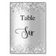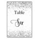 The table number is written with an elegant hand lettered style script. Black letters, a white background on front and faux silver background with faux glitter dust, sparkles on the back.