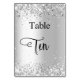 The table number is written with an elegant hand lettered style script. Black letters, a white background on front and faux silver background with faux glitter dust, sparkles on the back.