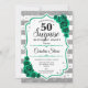 Surprise 50th Birthday Party Invitation. Feminine emerald green design with faux glitter silver. Features white and silver stripes, roses, script font and confetti. Perfect for an elegant women's bday celebration. Can be personalized to show any age. Printed Zazzle invitations or instant download digital printable template.
