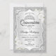 Quinceanera Party - Silver Invitation. Features stripes, script font, white roses, tiara and confetti. Classy design with faux glitter silver foil. Perfect for an elegant glam celebration.