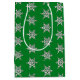 Icy, silver & white snowflake against a dark pine green background gift bag