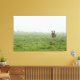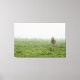 This stretched canvas wall art has an image of a brown bull standing in an Alberta prairies farm pasture on a foggy morning. The bull is staring intently at the photographer and there is a herd of cows in the distance.