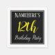 This simple and elegant paper napkin design features a message like "NameHere’s 12th Birthday Party", with the "12th" in fancy yellow-coloured text, within a black-coloured square area featuring a simple border outline. The name can be customised. Napkins like these could perhaps be used at a birthday party for somebody who is celebrating their twelfth birthday. [~Z0000150]