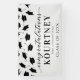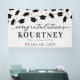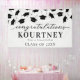 Modern graduation party banner featuring a simple white background that can be changed to any colour, falling black mortarboard caps, and a congratulations text template that is easy to personalise.