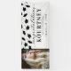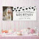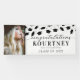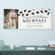 Modern graduation party banner featuring a simple white background that can be changed to any colour, a photo of the graduate, falling black mortarboard caps, and a modern text template that is easy to personalise.