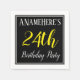 This simple and elegant paper napkin design features a message like "ANameHere’s 24th Birthday Party", with the "24th" in fancy yellow-coloured text, within a black-coloured square area featuring a simple border outline. The name can be customised. Napkins like these could perhaps be used at a birthday party for somebody who is celebrating their twenty fourth birthday. [~Z0000150]