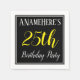 This simple and elegant paper napkin design features a message like "ANameHere’s 25th Birthday Party", with the "25th" in fancy yellow-coloured text, within a black-coloured square area featuring a simple border outline. A personalised name can be used. Napkins like these could perhaps be used at a birthday party for somebody who is celebrating their twenty fifth birthday. [~Z0000150]