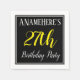 This simple and elegant paper napkin design features a message like "ANameHere’s 27th Birthday Party", with the "27th" in fancy yellow-coloured text, within a black-coloured square area featuring a simple border outline. The name can be customised. Napkins like these could perhaps be used at a birthday party for somebody who is celebrating their twenty seventh birthday. [~Z0000150]