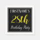 This simple and elegant paper napkin design features a message like "FirstName’s 28th Birthday Party", with the "28th" in fancy yellow-coloured text, within a black-coloured square area featuring a simple border outline. The name can be customised. Napkins like these could perhaps be used at a birthday party for somebody who is celebrating their twenty eighth birthday. [~Z0000150]