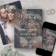 Invite family and friends to a simply elegant wedding celebration with a stylish 2 photo overlay invitation. Pictures and all wording are simple to personalise to include any details of your choice. (IMAGE PLACEMENT TIP: An easy way to centre a photo exactly how you want is to crop it before uploading to the Zazzle website.) The modern minimalist black and white design features two pictures of the engaged couple overlayed with trendy script calligraphy and chic typewriter style typography. All ceremony and reception wording can be customised or deleted. This invitation makes an elegant addition to the upcoming special day celebration. Congratulations to the bride and groom!
