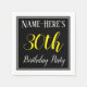 This simple and elegant paper napkin design features a message like "Name-Here’s 30th Birthday Party", with the "30th" in fancy yellow-coloured text, within a black-coloured square area featuring a simple border outline. The name can be customised. Napkins like these could perhaps be used at a birthday party for somebody who is celebrating their thirtieth birthday. [~Z0000150]