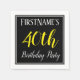 This simple and elegant paper napkin design features a message like "FirstName’s 40th Birthday Party", with the "40th" in fancy yellow-coloured text, within a black-coloured square area featuring a simple border outline. A custom name can be used. Napkins like these could perhaps be used at a birthday party for somebody who is celebrating their fortieth birthday. [~Z0000150]