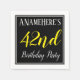 This simple and elegant paper napkin design features a message like "ANameHere’s 42nd Birthday Party", with the "42nd" in fancy yellow-coloured text, within a black-coloured square area featuring a simple border outline. The name can be customised. Napkins like these could perhaps be used at a birthday party for somebody who is celebrating their forty second birthday. [~Z0000150]