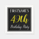 This simple and elegant paper napkin design features a message like "FirstName’s 49th Birthday Party", with the "49th" in fancy yellow-coloured text, within a black-coloured square area featuring a simple border outline. The name can be personalised. Napkins like these could perhaps be used at a birthday party for somebody who is celebrating their forty ninth birthday. [~Z0000150]