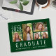 Simple green graduation announcement featuring a 5 picture photo collage and "Graduate" written across the bottom in large white letters. Add the class year, name and school or university in simple white typography.