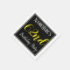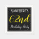 This simple and elegant paper napkin design features a message like "NameHere’s 62nd Birthday Party", with the "62nd" in fancy yellow-coloured text, within a black-coloured square area featuring a simple border outline. A custom name can be used. Napkins like these could perhaps be used at a birthday party for somebody who is celebrating their sixty second birthday. [~Z0000150]