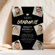 Modern real foil graduation party invitations featuring a stylish black background that can be changed to any colour, 6 photos of the graduate, and a simple text template that is easy to personalise.