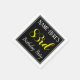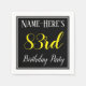 This simple and elegant paper napkin design features a message like "Name-Here’s 83rd Birthday Party", with the "83rd" in fancy yellow-coloured text, within a black-coloured square area featuring a simple border outline. A custom name can be used. Napkins like these could perhaps be used at a birthday party for somebody who is celebrating their eighty third birthday. [~Z0000150]