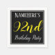 This simple and elegant paper napkin design features a message like "NameHere’s 92nd Birthday Party", with the "92nd" in fancy yellow-coloured text, within a black-coloured square area featuring a simple border outline. A custom name can be used. Napkins like these could perhaps be used at a birthday party for somebody who is celebrating their ninety second birthday. [~Z0000150]