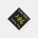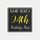 This simple and elegant paper napkin design features a message like "Name-Here’s 94th Birthday Party", with the "94th" in fancy yellow-coloured text, within a black-coloured square area featuring a simple border outline. The name can be customised. Napkins like these could perhaps be used at a birthday party for somebody who is celebrating their ninety fourth birthday. [~Z0000150]
