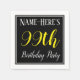 This simple and elegant paper napkin design features a message like "Name-Here’s 99th Birthday Party", with the "99th" in fancy yellow-coloured text, within a black-coloured square area featuring a simple border outline. A custom name can be used. Napkins like these could perhaps be used at a birthday party for somebody who is celebrating their ninety ninth birthday. [~Z0000150]