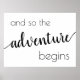 Simple monochrome black and white flourish horizontal "and so the adventure begins" shower, party, or reception table signage featuring a fun, casual hand-lettered script. The classic design includes a modern handlettered quote typography overlay. The lovely font with a customisable background colour makes it easy to fit any theme. For other colours or matching products, please visit the JustFharryn Zazzle store, or contact the designer, c/o fharryn@yahoo.com All rights reserved. #zazzlemade