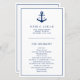 Nautical wedding program featuring a navy blue anchor with your monogram on either side, over a white background. The front has your ceremony events and the backside has your wedding party. A simple yet elegant design that is perfect for a beach themed celebration in the summer. These cheap wedding programs are printed on sheets of paper for a budget friendly option.