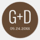 Simple and elegant initials brown wedding Classic Round Sticker. It displays your initial and the date of your wedding in white on brown. It coordinates with our "Colourful leaf print" products for a fall or autumn wedding.