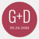 Simple and elegant initials burgundy red wedding Classic Round Sticker. It displays your initial and the date of your wedding in white on vivid burgundy red. It coordinates with our "Colourful leaf print" products for a fall or autumn wedding.