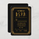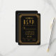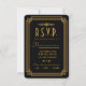 These RSVP response cards feature a black and gold colour palette, a geometric frame, and other stylistic details all inspired by Art Deco and the roaring twenties. You can customise the sample text fields to your liking.