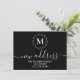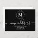 Simple and elegant black background featuring a delicate white botanical wreath monogram, white typography for new address details.