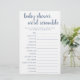 Unscramble the baby words! Simple baby shower or gender reveal word scramble party game (with answers below) featuring a fun, casual hand-lettered script. The classic design includes a modern handlettered quote typography overlay. For other colours or matching products, please visit the JustFharryn Zazzle store, or contact the designer, c/o Fharryn@yahoo.com All rights reserved. #bohochic #zazzlemade