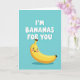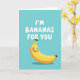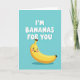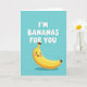 This greeting card shows a golden-yellow banana character sitting along the lower part of the front, set against a teal background. The banana has wide dark eyes with tiny white highlights, pink blush on its cheeks, and a big curved smile that makes it look truly happy. Its stem and tip are dark brown, which adds a little contrast against the smooth peel. Near the top, the message “I’M BANANAS FOR YOU” appears in large white letters with a slight shadow that helps the words stand out. The banana’s upward gaze points you right toward that line, tying the picture and message together in a sweet way. It feels meaningful to give because it’s funny and affectionate at the same time, like a simple way to say “you make me smile” 🥰. The limited colors keep the focus on the cheerful face and the message, making it easy to read at a glance ❤️. Hope it helps you share Valentine’s Day feelings with someone you care about.