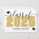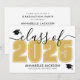 This classic yet modern horizontal graduation announcement doubles as a party invitation. The front features an oversized "Class of 2025" in bold black and white, with the year in a rich yellow gold, complemented by elegant grey script accents. Two graduation cap icons add a celebratory touch, with space below for the graduate's name and school. Colours can be customised to match school colours for a personalised look.