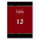 A modern simple red, black and white wedding table number with gold and silver trim stripes.