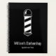 A barbershop pole is on the cover of this black barbershop appointment book. Under the picture, there are two lines of white display text you can edit to create a custom message such as adding the shop's name.
