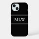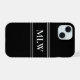 This black iPhone case has three white letters in the centre. You can change the letters to display the correct monogram. Two white horizontal lines are above and below the initials.