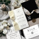 Personalise this elegant, modern, & minimalist black and white + grey wedding invitation informal RSVP enclosure card with instructions for your guests to scan your custom wedding website QR code to reply, featuring calligraphy script typography and bold solid black back side with custom bride and groom monogram ♥