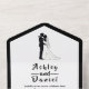 This elegant black-and-white arch wedding invitation is perfect for a modern wedding. The simple design features elegant black calligraphy and a bride and groom illustration on a clean white background.