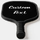 This black pickleball paddle has display text in a white script. The text can be edited or deleted.