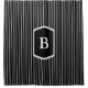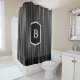 This black shower curtain has an initial that you can change to show the correct monogram. The letter is white and is framed. Vertical black and white stripes are in the background. This shower curtain has a classic black and white colour scheme.