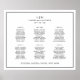 Simple horizontal wedding seating chart poster featuring a modern yet elegant design with your two letter monogram, names and date with the chart below, surrounded by a thin border. The template has three columns with six tables of ten guests as an example, but can be customised for your number of tables and guests. At the bottom is the venue and state. A chic and stylish black and white design that is great for a minimalist couple.